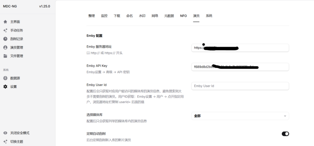 - Emby地址和API Key:添加刮削的Emby地址和API Key,如果没有就自行创建。